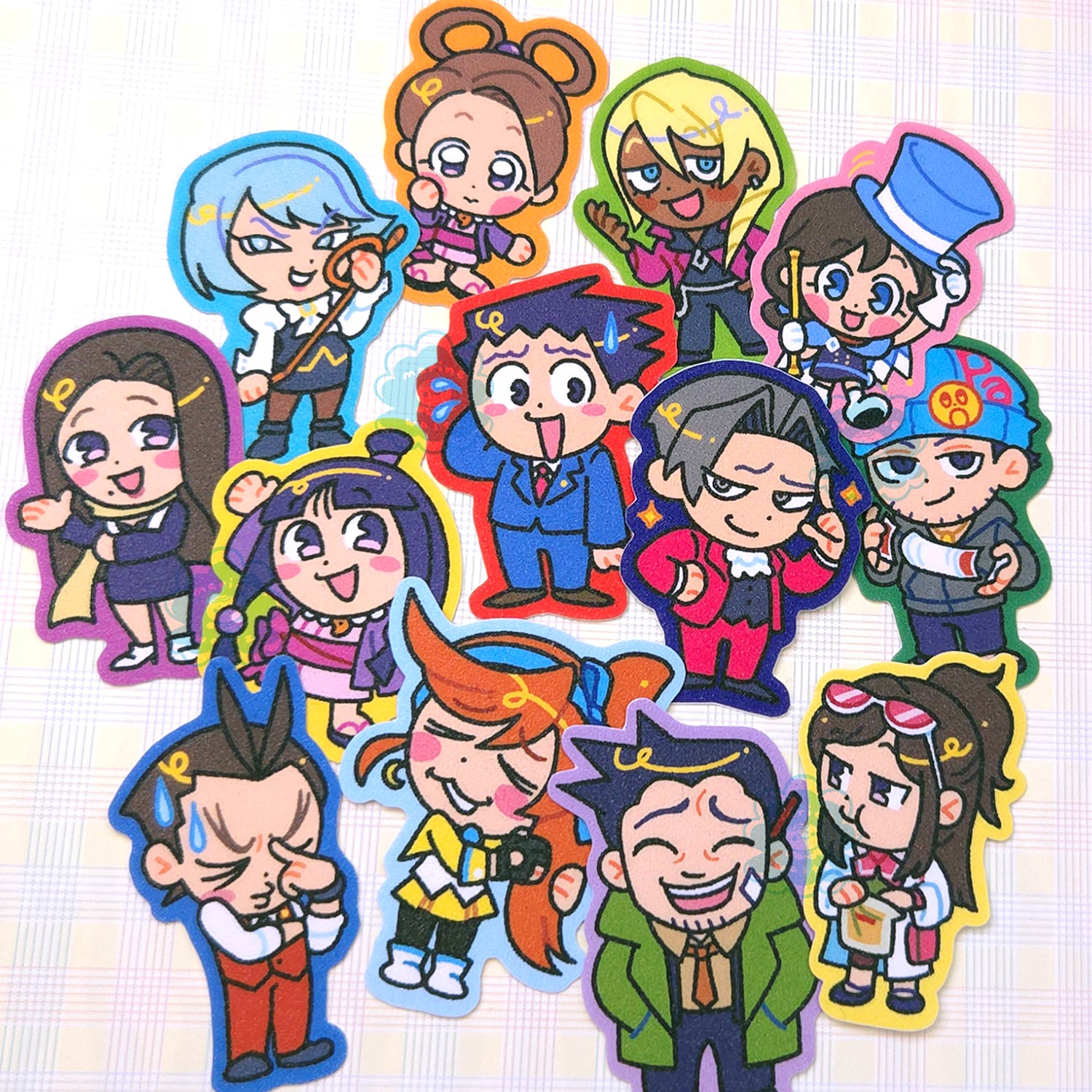 Size: ~5cm / 2" vinyl stickers with a matte glitter finish. Some characters are shorter (like Trucy and Pearl) and some are taller (mainly Apollo's hair) depending on the design!